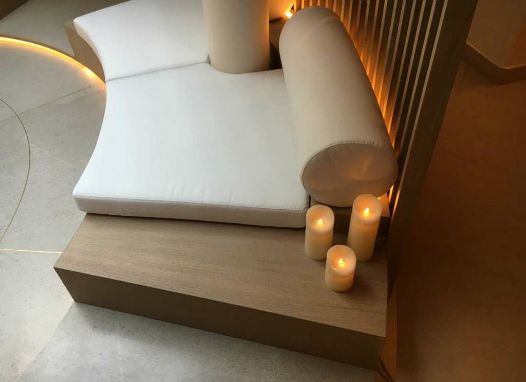 Il lusso di un ambiente di coccola rifinito nei minimi dettagli di pregio studiati per esprimere il comfort e l’equilibrio che una Spa richiede. Il rosone rotondo centrale è realizzato in listelli a croce progettati per l’ingresso della luce naturale dall’esterno. Al suo interno abbiamo realizzato la panca curva sagomata completamente in dima. Le doghe in Rovere sono installate nel pieno dell’armonia dell’ambiente, così da alleggerirla creando uno spazio aperto che respira e filtra la luce.
